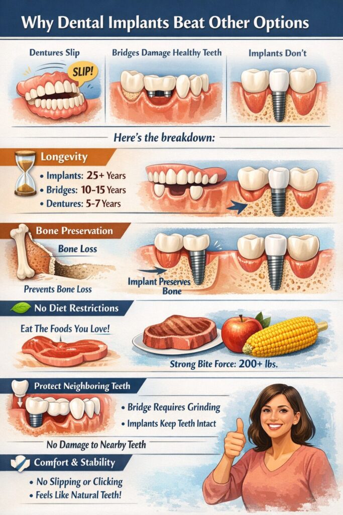 Dentures slip. Bridges damage healthy teeth. Implants don’t.